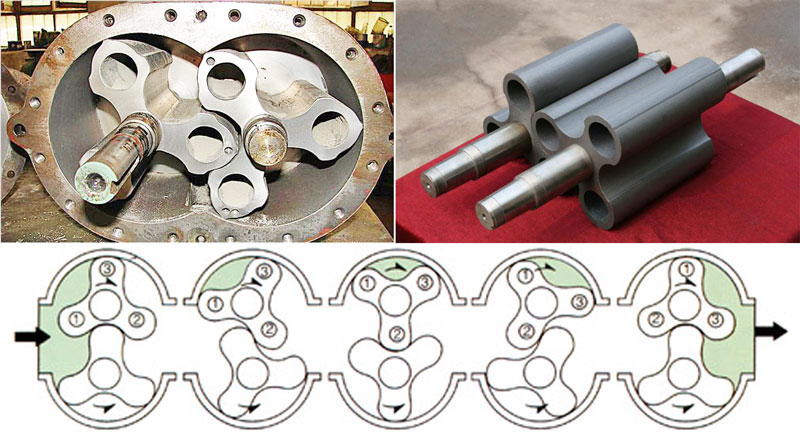 上面的图式罗茨鼓风机内部结构,转子,还有就是罗茨鼓风机的工作原理图。